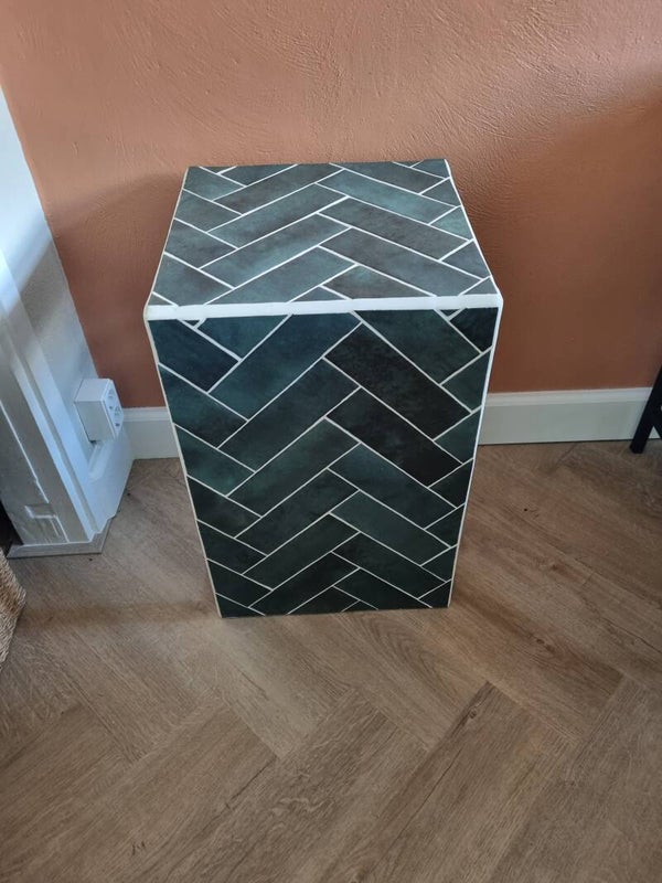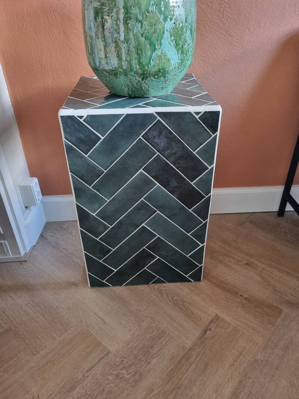 Deze mooie tegeltafel heeft een donkerbruine basis met daarop een donkergroene tegel in visgraat motief. De zijkanten zijn open.