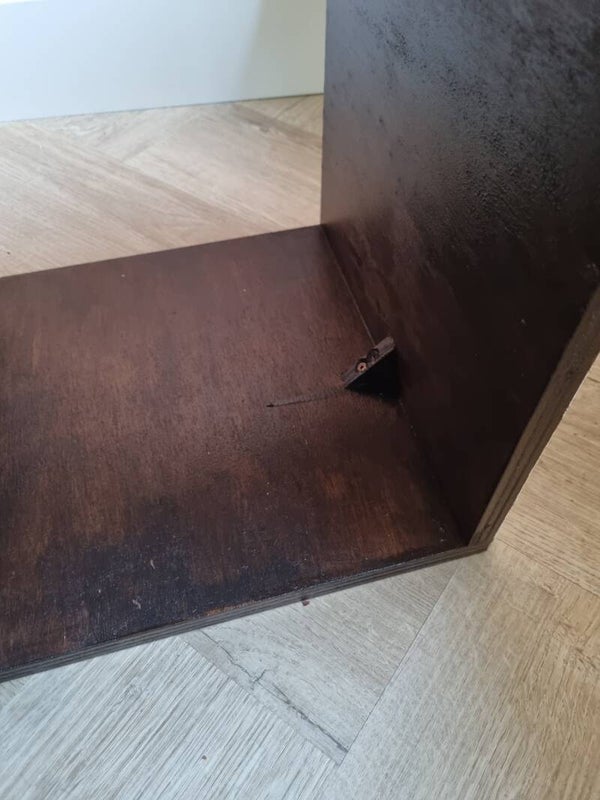 De basis van de tegeltafel is van hout en afgewerkt met een donkerbruine beits. Binnenin kun je nog lichte kwastsporen zien. Deze vallen niet op. Ook zitten er in het kastje twee driehoekjes ter versteveging (te zien op de foto).